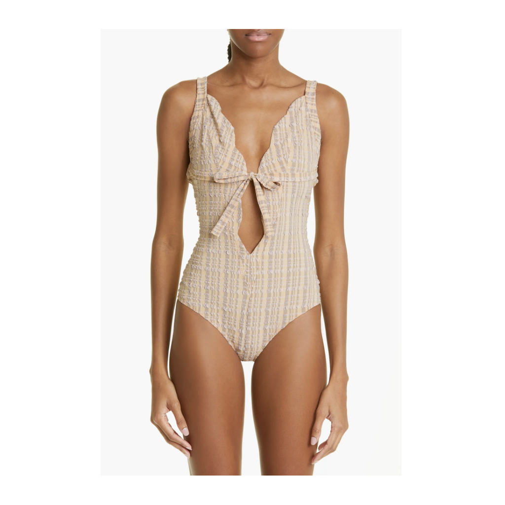This statement swimsuit has a plunging scallop neckline and you can tie the adjustable bow to secure it in the perfect place. Lisa Marie Fernandez's signature seersucker fabrication is artfully seamed and molds to the body for the perfect fit.