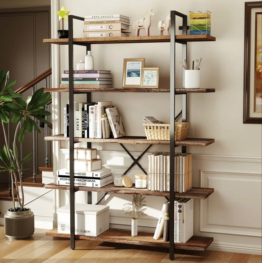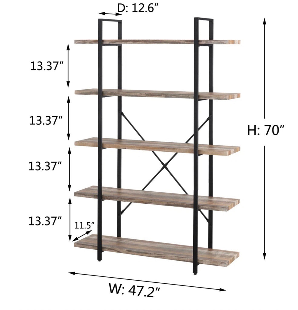 5 wood shelves and metal supports. Unit measures 47.2" wide by 70" tall by 12.6" deep